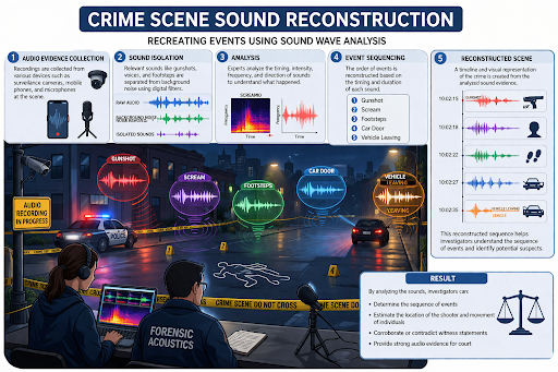 In modern forensic science, evidence is not limited to fingerprints, DNA, or bloodstains. Sound has emerged as an important source of information that can help investigators reconstruct events and identify suspects. Every sound produced during a criminal act—such as gunshots, screams, footsteps, or vehicle movement—creates vibrations that travel through the environment and can be recorded or analyzed later. These sound waves carry crucial information about time, location, distance, and intensity, which can be used to solve criminal cases.